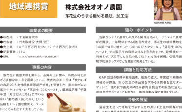 落花生一筋で主人と二人三脚で落花生の栽培に励んできました。精魂込めて作った落花生を食材のみで終わらせたくないとの思いから“落花生100%ペースト”等を商品化。その美味しさが評価され、有名百貨店での販売や、「食のちばの逸品を発掘2015」コンテストにおいて女性起業家等部門で金賞を受賞。現在は息子も農業法人に加わり、多くのスタッフと一緒に日々美味しい落花生商品の生産に取り組んでいます。